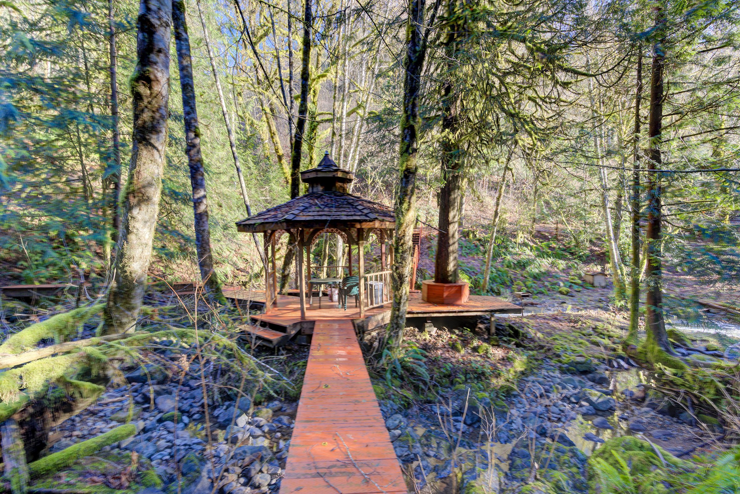 • Property features wood walkway decking down to creek and all around to several gazebos